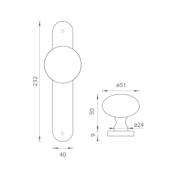 The door fixed straight ball on the oval shield is made of high quality materials - brass and is surface treated. The ball has a diameter of 51 mm and the shield has dimensions of 40 mm x 232 mm.