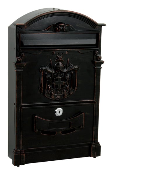 The mailbox with a historical motif is made of aluminum and has a surface treatment.