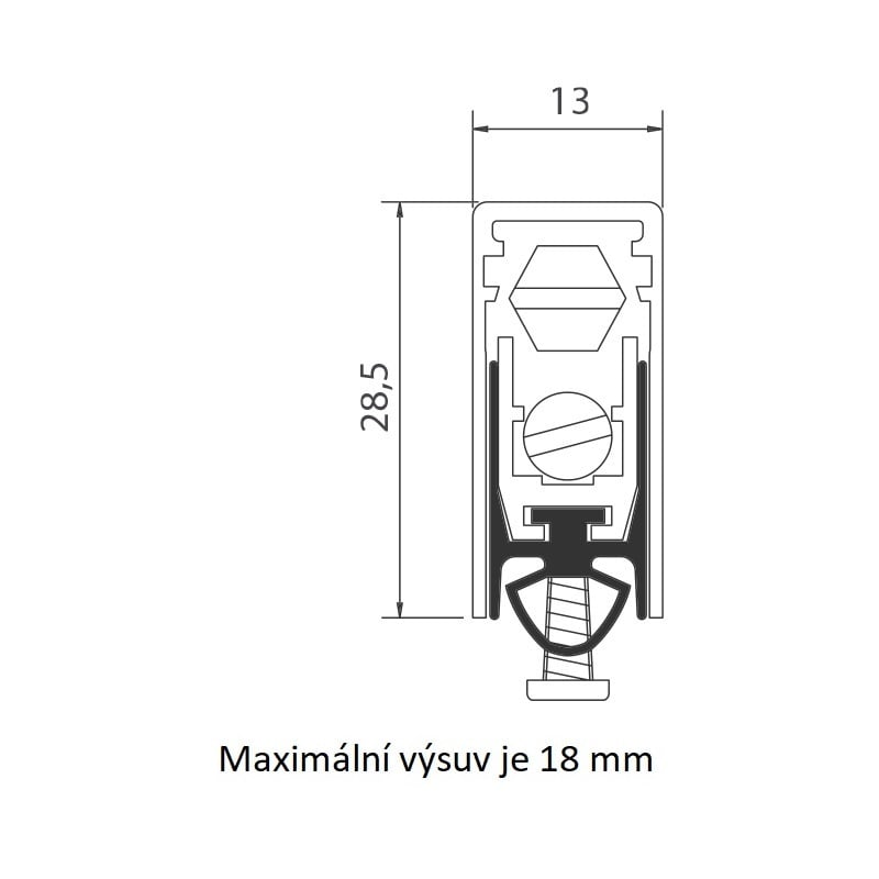 Adjustable extension of the sealing strip by means of a brass hexagonal button. The maximum extension is 18 mm. U-shaped profile. Fastening the profile without the need to pull out the retractable sealing strip. Self-tapping screws for metal. Non-flammable silicone gasket.