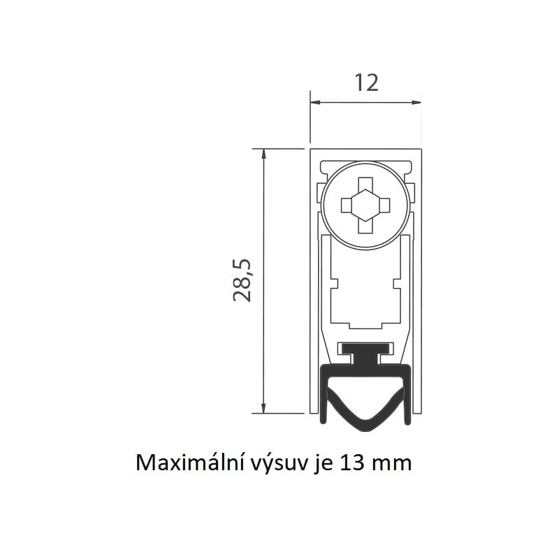 Adjustable extension of the sealing strip via a round nylon button. The maximum extension is 13 mm. "U" shaped profile. Rubber seal.