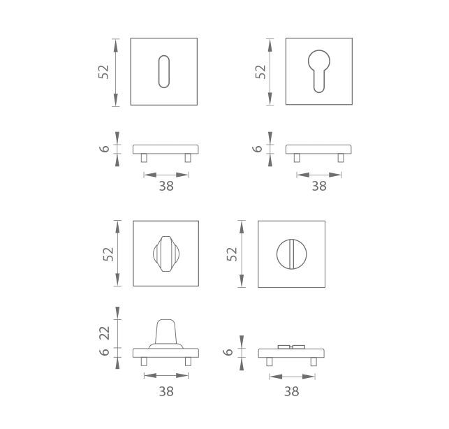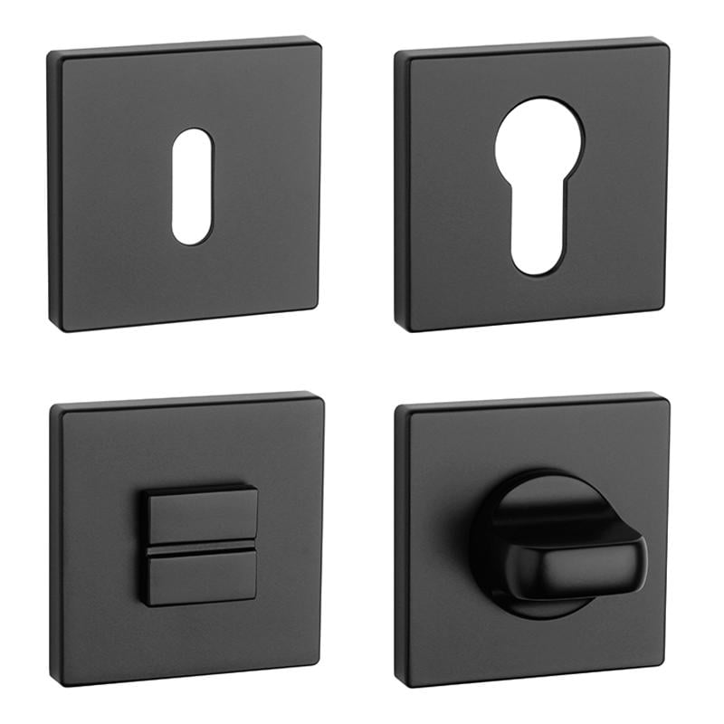 The square rosette is made of high quality materials - zamak and is surface treated. The rosette has a size of 52x52 mm, a thickness of 7 mm and an oval hole for an interior key (BB), a hole for a cylinder insert (PZ), WC set with a built-in key. The package contains 2 pieces of rosettes (a pair) and the toilet rosettes are in the package as a set.