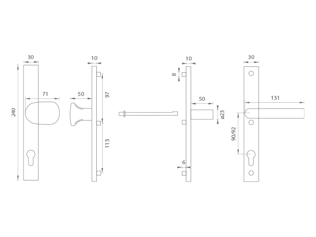 For reinforced fittings, you need to know the distance between the axis of the handle and the axis of the key (pitch). The standard fitting spacing is 92 mm. An alternative spacing of 90 mm is obtained by turning the 6 x 8 mm square by 90°. A 6 x 8 mm square is part of the hardware package with a spacing of 90 mm.