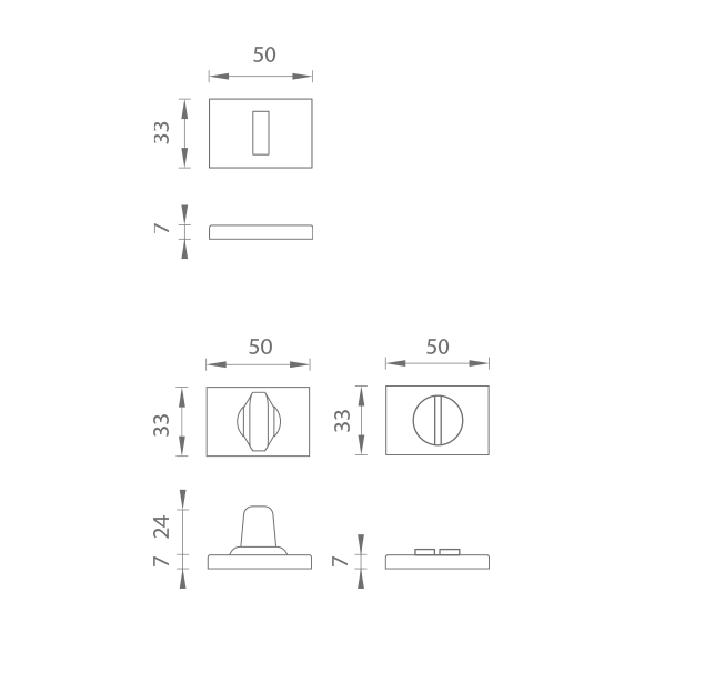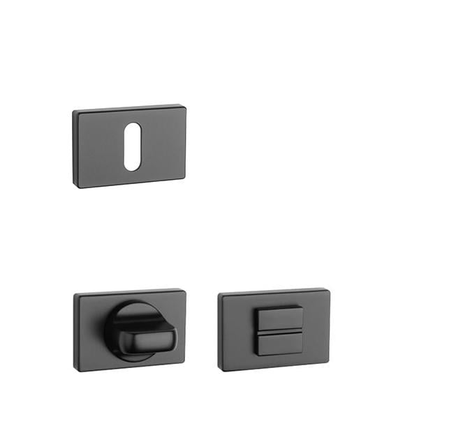 The rectangular rosette is made of high-quality materials - zamak and has a surface treatment. The rosette has dimensions of 50 x 33 mm, thickness of 7 mm and an oval hole for an interior key (BB), a hole for a cylinder insert (PZ), WC set with a built-in key. The package contains 2 pieces of rosettes (a pair) and the toilet rosettes are in the package as a set.