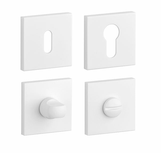 The square rosette is made of high quality materials - zamak and is surface treated. The rosette has a size of 52x52 mm, a thickness of 7 mm and an oval hole for an interior key (BB), a hole for a cylinder insert (PZ), WC set with a built-in key. The package contains 2 pieces of rosettes (a pair) and the toilet rosettes are in the package as a set.