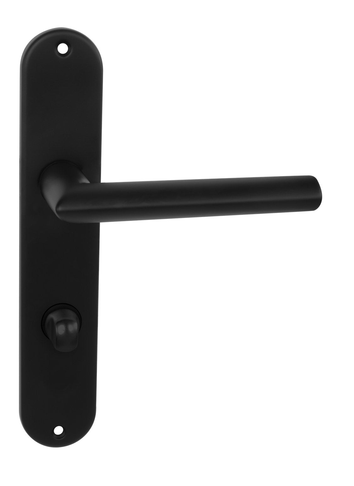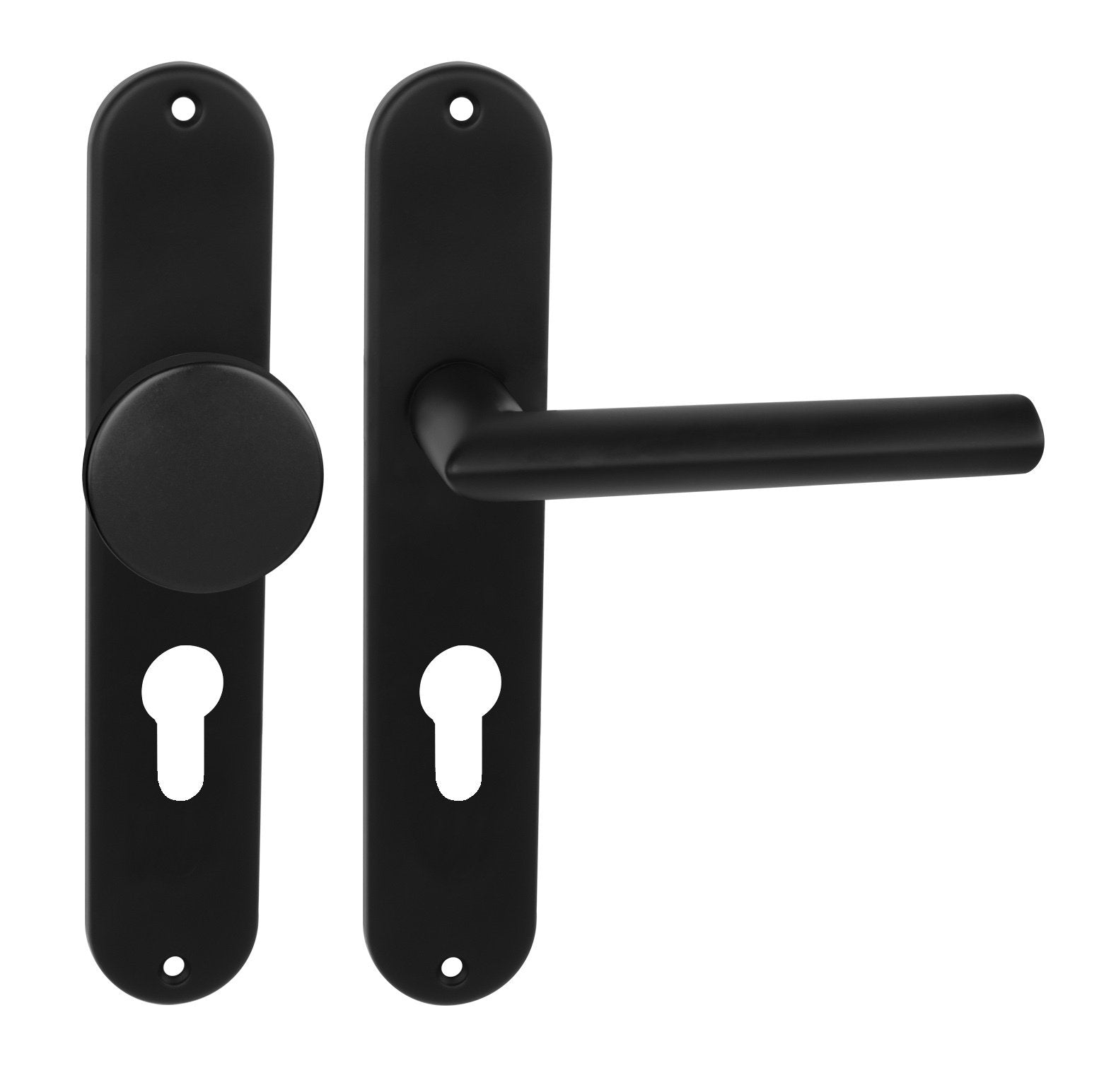 The shield handle for interior doors with an oval shield is made of aluminum and has a surface treatment. The oval shield measures 40mm x 225mm and the handle does not include a return mechanism....