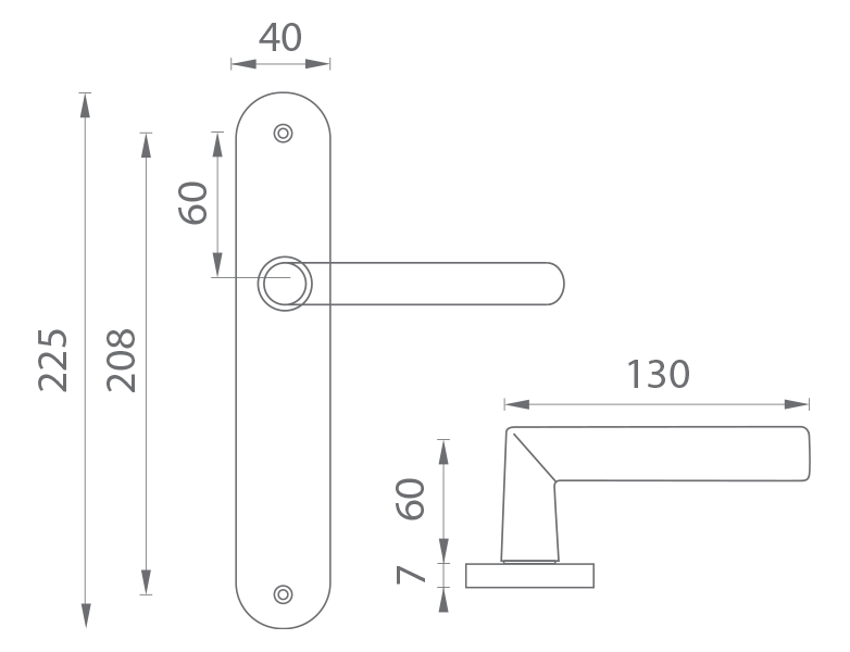 The shield handle for interior doors with an oval shield is made of aluminum and has a surface treatment. The oval shield measures 40mm x 225mm and the handle does not include a return mechanism....