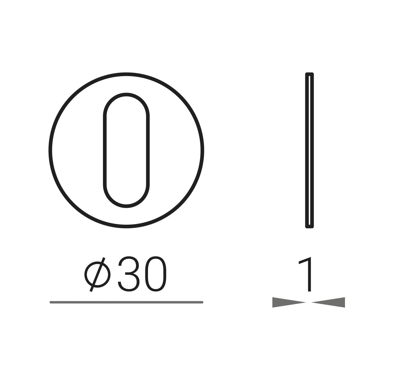 The round rosette is made of high-quality zamak material and has a surface treatment. The rosette has a diameter of 30 mm and a thickness of 1 mm. The rosette has an oval opening for an interior key (BB). The package contains 2 pieces of rosettes (pair). The rosettes can be combined with any handle from the NUDA collection.