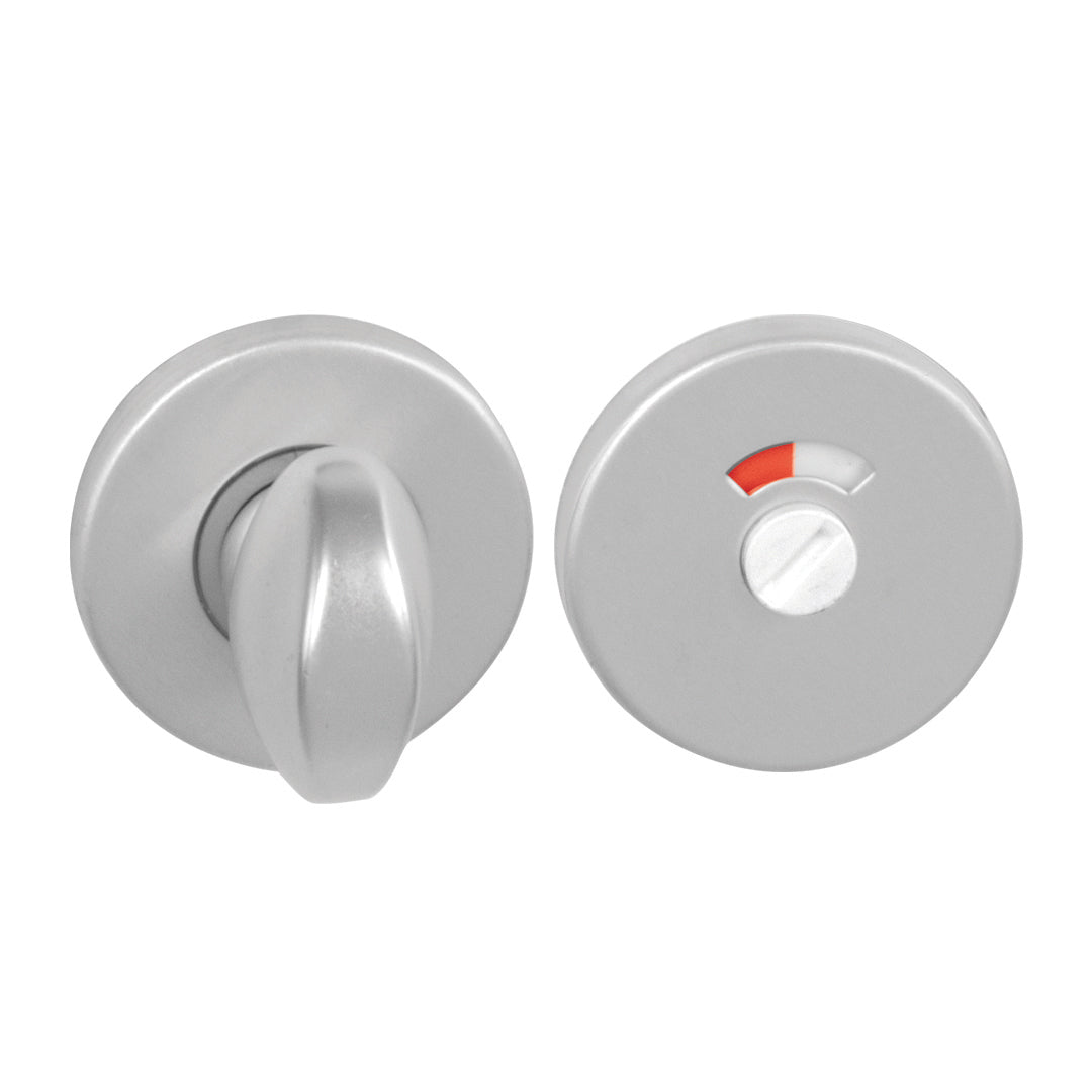 The round rosette is made of aluminum and has a surface treatment. The rosette has a diameter of 50 mm, a thickness of 7 mm and an oval hole for an interior key (BB), a hole for a cylinder insert (PZ), WC set with a built-in key and indicator. The package contains 2 pieces of rosettes (a pair) and the toilet rosettes are in the package as a set.