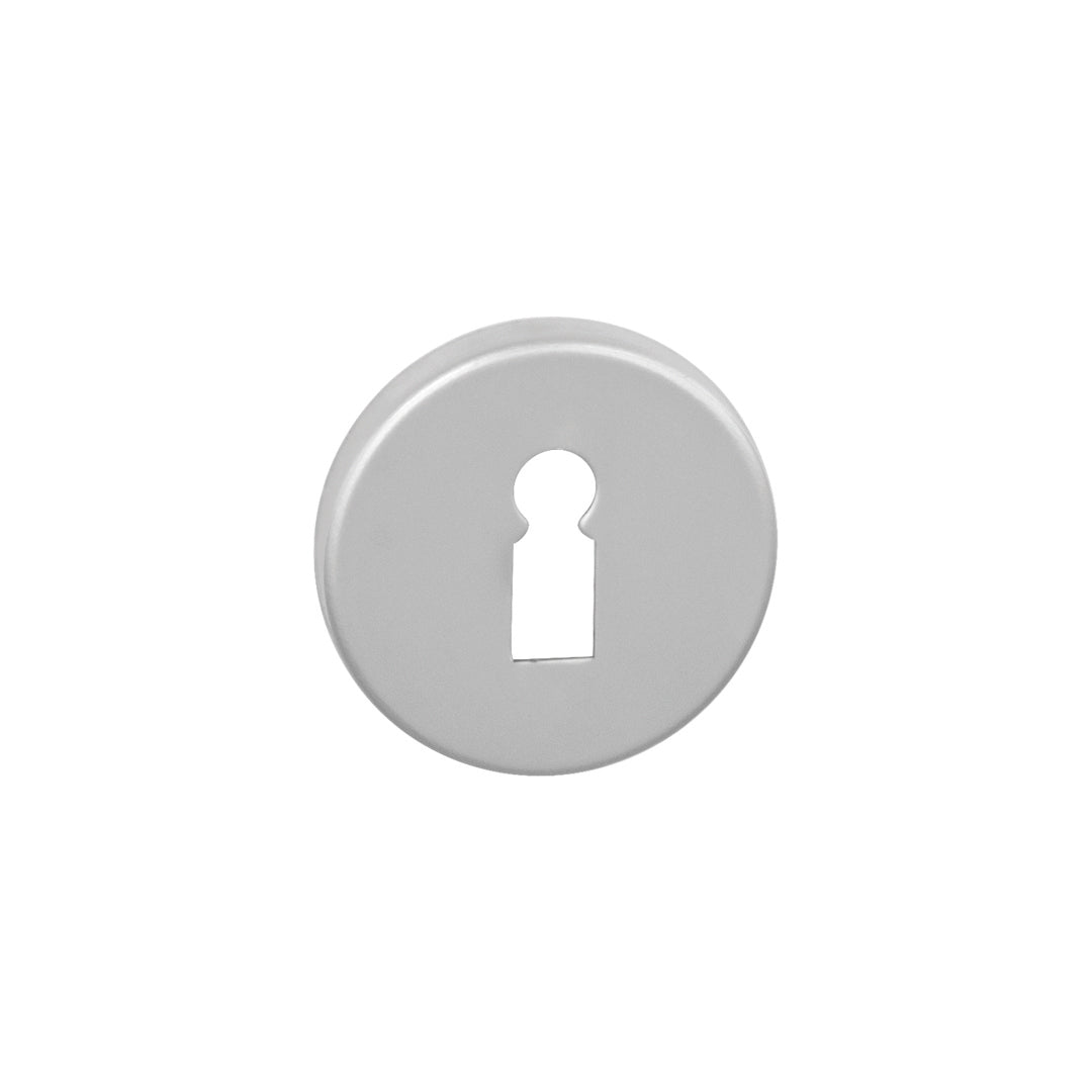The round rosette is made of aluminum and has a surface treatment. The rosette has a diameter of 50 mm, a thickness of 7 mm and an oval hole for an interior key (BB), a...
