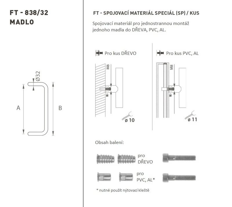 The door handle is made of high-quality stainless steel, known as stainless steel, and is surface treated. The handle profile is 32 mm. The SPECIAL (SP) set contains fasteners for one-sided mounting of one handle...