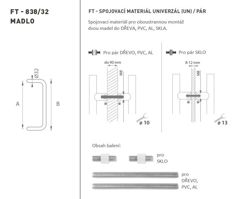 The door handle is made of high-quality stainless steel, known as stainless steel, and is surface treated. The handle profile is ƒÆ’†€™ƒ€ ¢‚¬„¢ƒÆ’¢‚¬ ƒ¢¢€š¬¢€ž¢ƒÆ’†€™ƒ¢¢€š¬‚¹ƒÆ’¢‚¬¦ƒ¢¢€š¬…€œ 32 mm. The UNIVERSAL (UN) set contains fasteners for double-sided mounting of two handrails in wood, PVC, AL, glass.