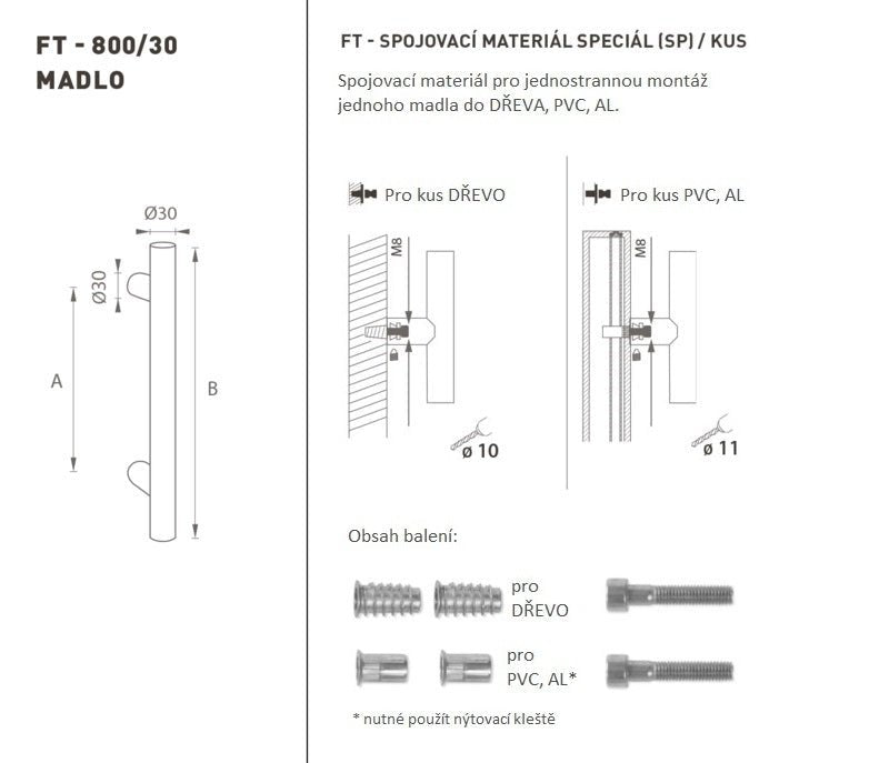 The door handle is made of high-quality stainless steel, known as stainless steel, and is surface treated. The handle profile is 30 mm. The SPECIAL (SP) set contains fasteners for one-sided mounting of one handle...