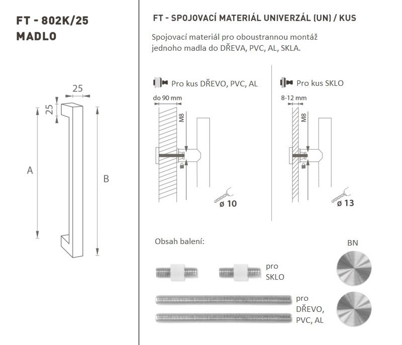 The door handle is made of high-quality stainless steel, known as stainless steel, and is surface treated. The handle profile is 25 x 25 mm. The UNIVERSAL (UN) set contains fasteners for two-sided mounting of one handle in wood, PVC, AL, glass.