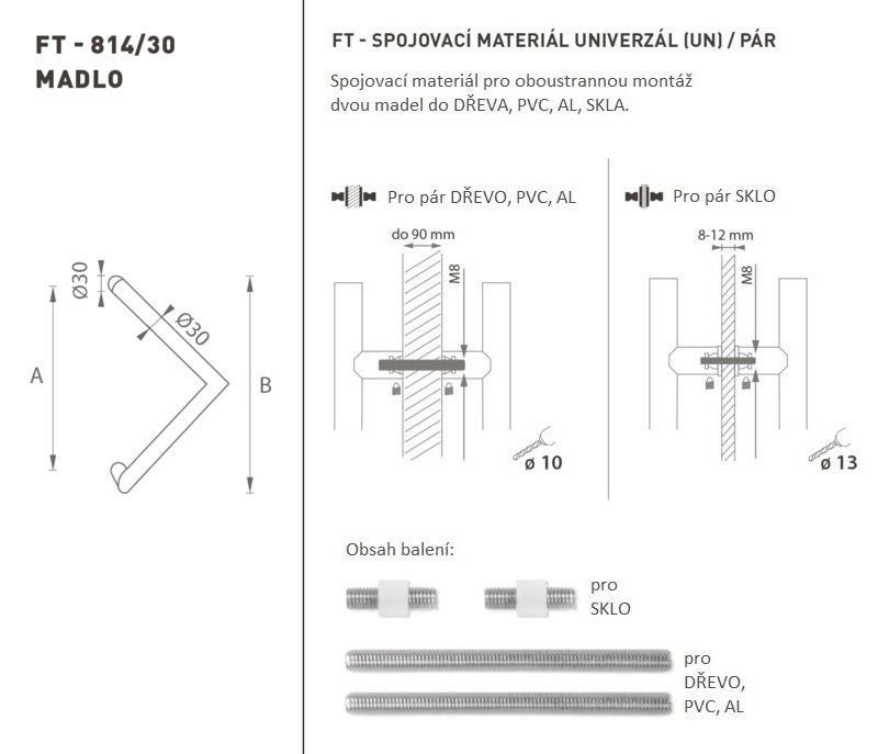 The door handle is made of high-quality stainless steel, known as stainless steel, and is surface treated. The handle profile is 30 mm. The UNIVERSAL (UN) set contains fasteners for double-sided mounting of two handles...