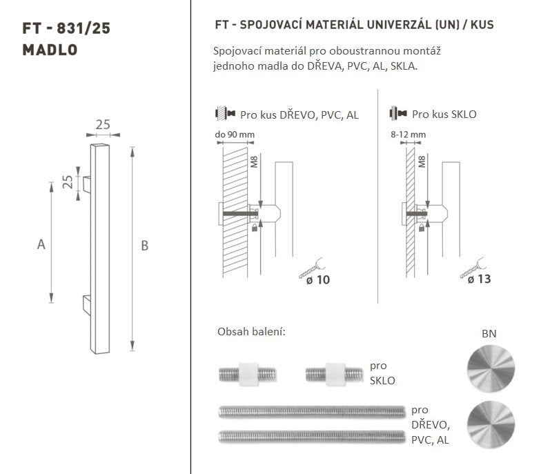 The door handle is made of high-quality stainless steel, known as stainless steel, and is surface treated. The handle profile is 25 x 25 mm. The UNIVERSAL (UN) set contains fasteners for two-sided mounting of one handle in wood, PVC, AL, glass.
