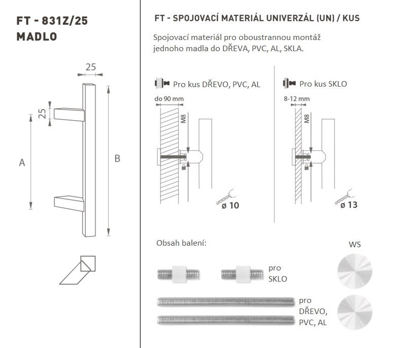 The door handle is made of high-quality stainless steel, known as stainless steel, and is surface treated. The handle profile is 25 x 25 mm. The UNIVERSAL (UN) set contains fasteners for two-sided mounting of one handle in wood, PVC, AL, glass.