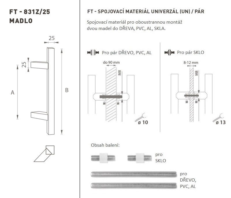 The door handle is made of high-quality stainless steel, known as stainless steel, and is surface treated. The handle profile is 25 x 25 mm. The UNIVERSAL (UN) set contains fasteners for double-sided mounting of two handrails in wood, PVC, AL, glass.