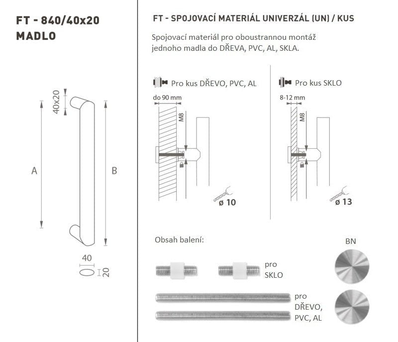 The door handle is made of high-quality stainless steel, known as stainless steel, and is surface treated. The handle profile has dimensions of 40 x 20 mm. The UNIVERSAL (UN) set contains fasteners for double-sided mounting of two handrails in wood, PVC, AL, glass.