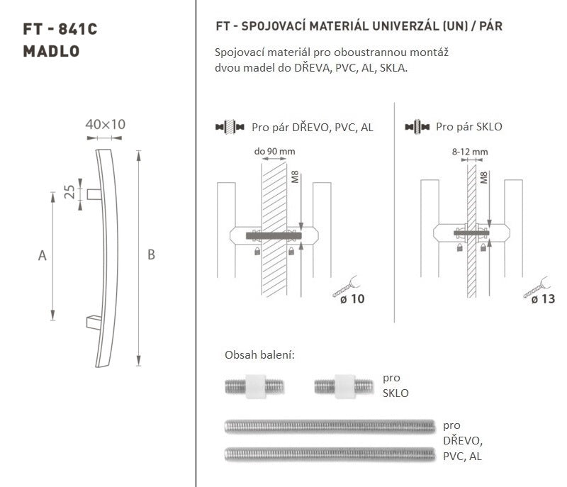 The door handle is made of high-quality stainless steel, known as stainless steel, and is surface treated. The handle profile is 40 x 10 mm. The UNIVERSAL (UN) set contains fasteners for double-sided mounting of two handrails in wood, PVC, AL, glass.