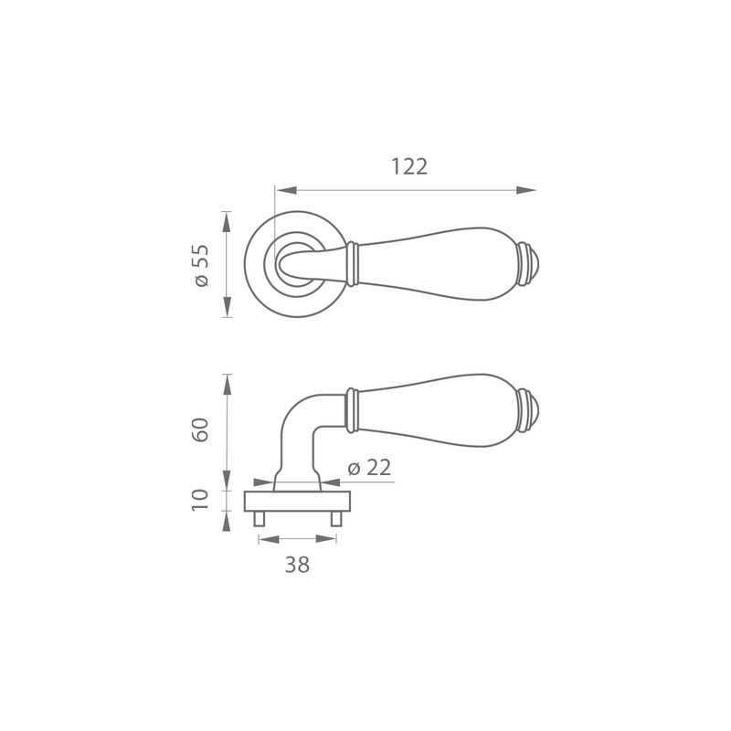 The rosette handle for interior doors with a round rosette is made by casting from a high-quality zinc alloy in combination with ceramics and has a surface treatment.ƒÆ’†€™ƒ€ ¢‚¬„¢ƒÆ’‚¢ƒ¢¢‚¬Å¡‚¬ƒ€¦‚¡ƒÆ’†€™ƒ¢¢€š¬…¡ƒÆ’¢‚¬Å¡ƒ€š‚ Rosette diameter: 55 mmRosette thickness: 10 mmHandle construction:...