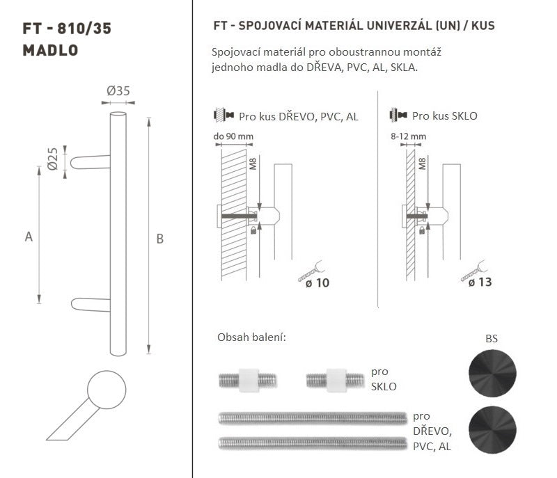 The door handle is made of high-quality stainless steel, known as stainless steel, and is surface treated. The handle profile is 35 mm. The UNIVERSAL (UN) set contains fasteners for two-sided mounting of one handle...