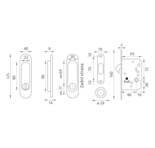 Round set for sliding door with toilet key.Dimensions of the lock face:Length: 160 mmWidth: 18 mmThickness: 2 mmWidth of the lock body: 12 mmSill: 65 mmSpacing: 70 mm (distance between the handle hole and insert...