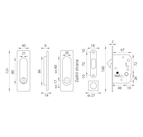 Square sliding door set with toilet key. Set includes: lock ATZ 1171, pair of shells - FT - 3663AR, hook ATZ - 3919
