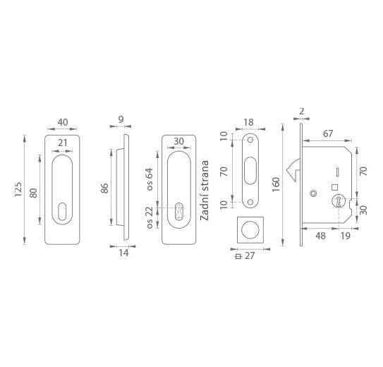 Square sliding door set with hole for interior key (BB). Set includes: lock ATZ 1175, pair of shells - FT - 3663AF, hook ATZ - 3919