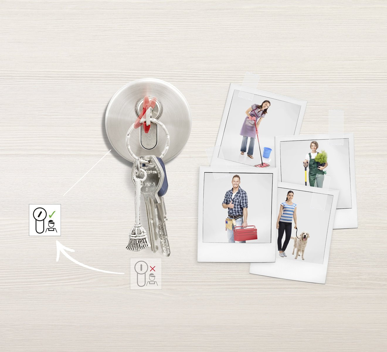 By turning the key again to the vertical position (6 o'clock), the service key cannot unlock the door. If the door is locked with a service key from the outside, the owner's key can unlock the door from the bell even in the 8 o'clock position. The owner always has access, even if the service key is inserted in the cylindrical insert from the inside.