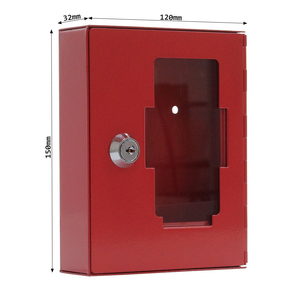 A red key box that is used to store an important key or a bundle of multiple keys. If necessary, the glass can be broken with a hammer. The package includes material for anchoring the cabinet to the wall.