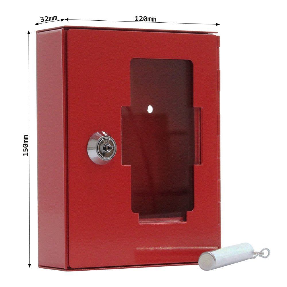 A red key box that is used to store an important key or a bundle of multiple keys. If necessary, the glass can be broken using an attached hammer. The package includes material for anchoring the cabinet to the wall.