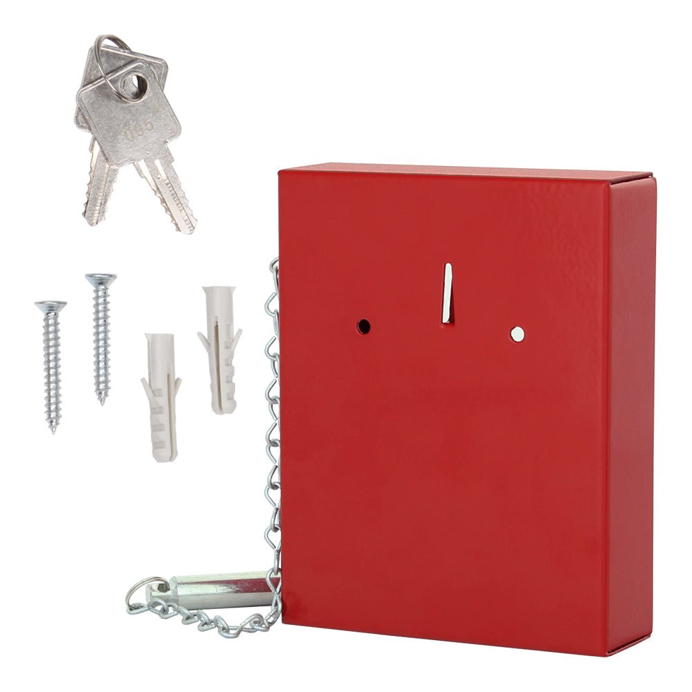 A red key box that is used to store an important key or a bundle of multiple keys. If necessary, the glass can be broken using an attached hammer. The package includes material for anchoring...