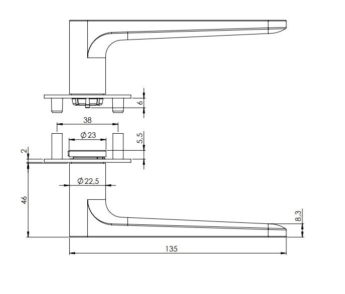 The handle mechanism includes a return spring. The protrusions on the rosette prevent it from turning, and the screws for screwing through the entire width of the door guarantee a stronger and more stable fitting of the fittings.