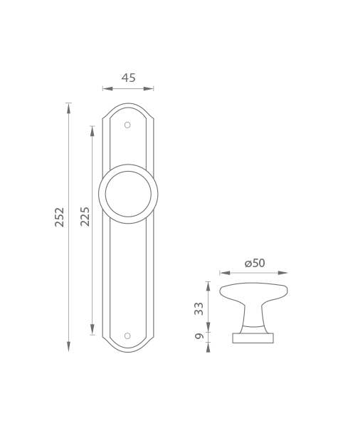 The solid straight door ball on the rustic shield is made of high quality materials - brass and has a surface treatment. The ball has a diameter of 50 mm and the shield has dimensions of 45 x 252 mm.