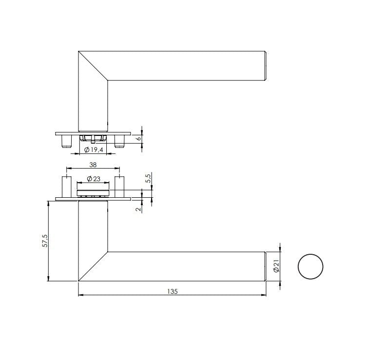 The rosette handle LUCIA PIATTA S on an interior door with a round rosette is made of high-quality stainless steel, known as stainless steel, and is surface treated. The rosette has a diameter of 54 mm and a thickness of 2 mm.
