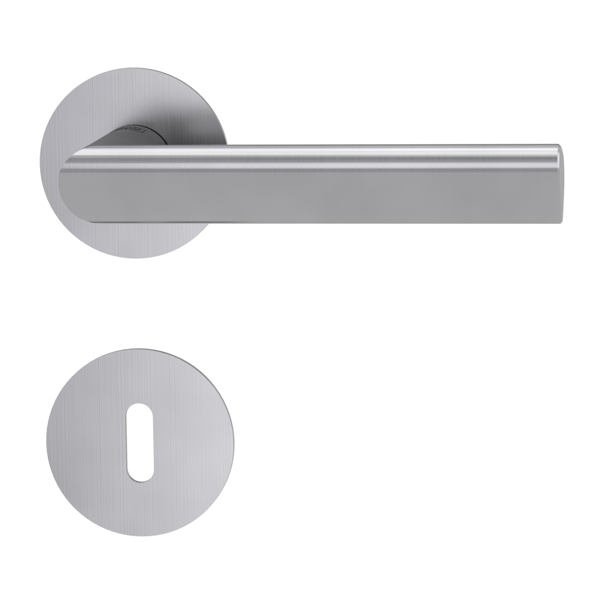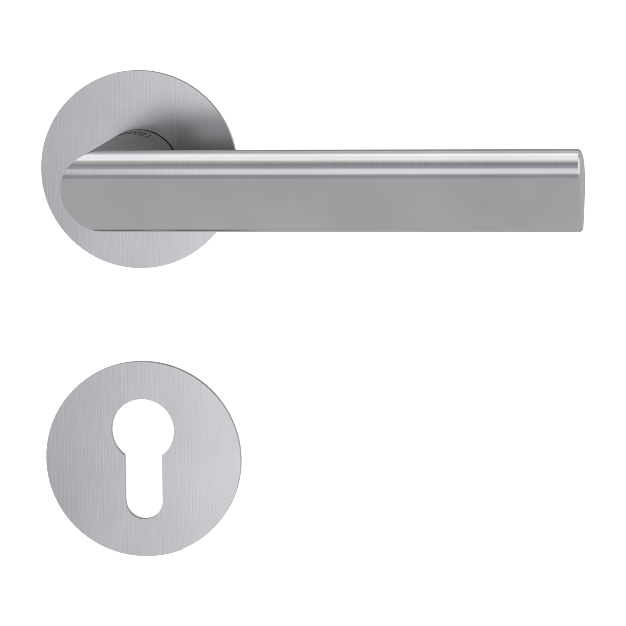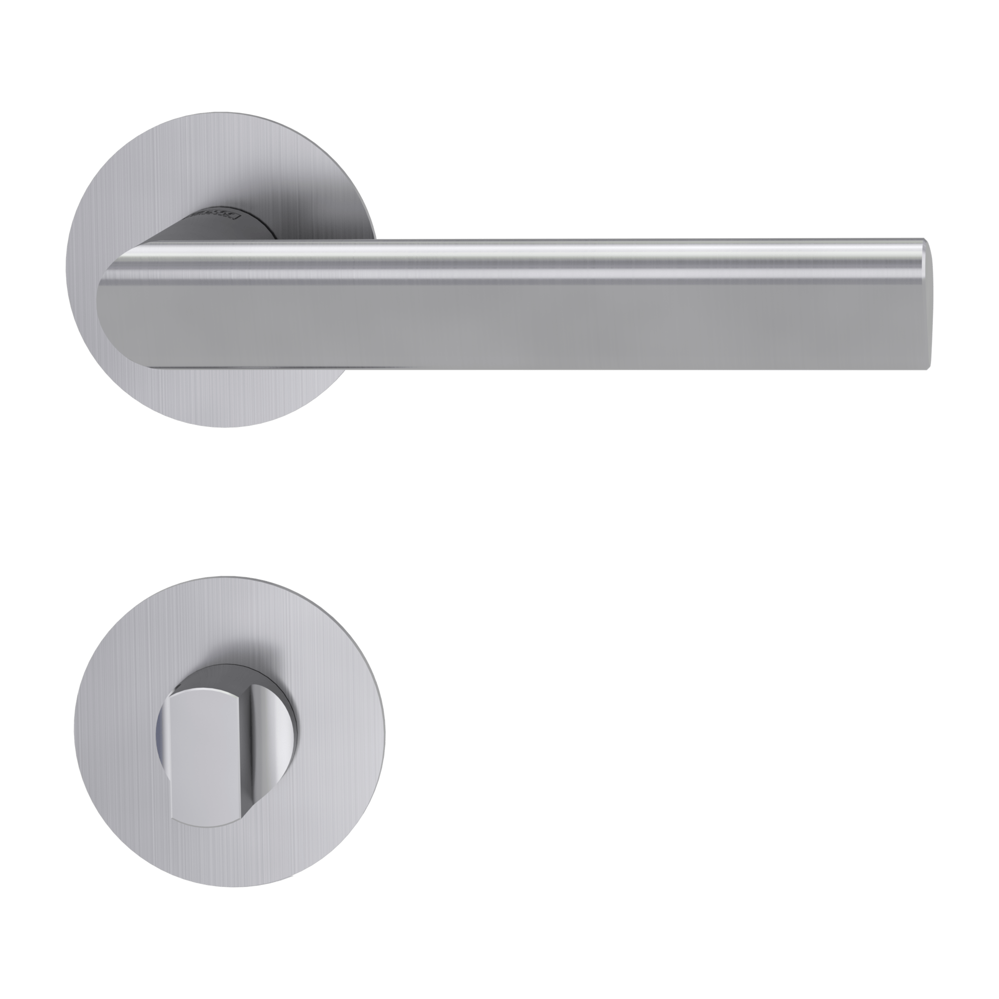 The rosette handle TRI 134 PIATTA S on an interior door with a round rosette is made of high-quality stainless steel, known as stainless steel, and is surface treated. The rosette has a diameter of 54 mm and a thickness of 2 mm.