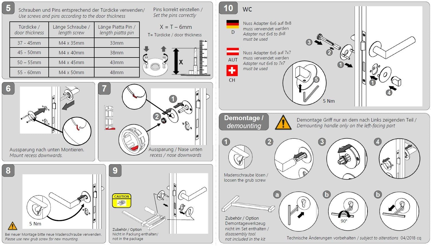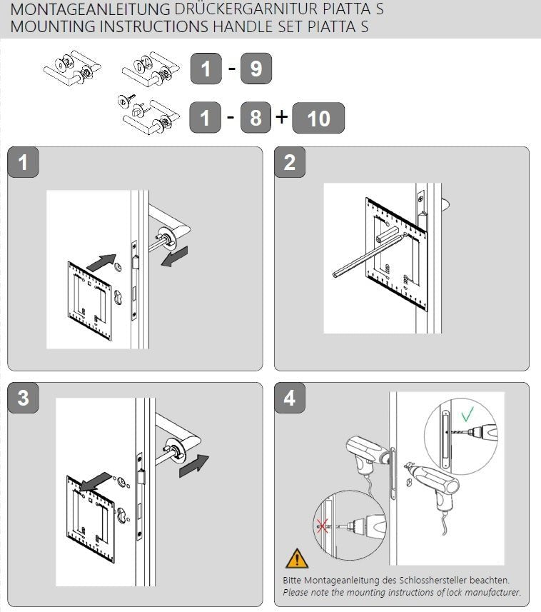 The standard fittings are supplied with screws and a square (8x8 mm) for a door thickness of 38 - 45 mm.