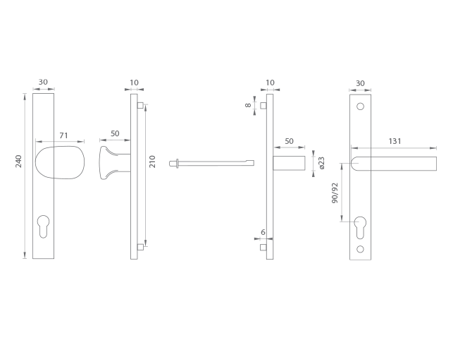 For reinforced fittings, you need to know the distance between the axis of the handle and the axis of the key (pitch). The standard fitting spacing is 92 mm. An alternative spacing of 90 mm is obtained by turning the 6 x 8 mm square by 90°. A 6 x 8 mm square is part of the hardware package with a spacing of 90 mm.
