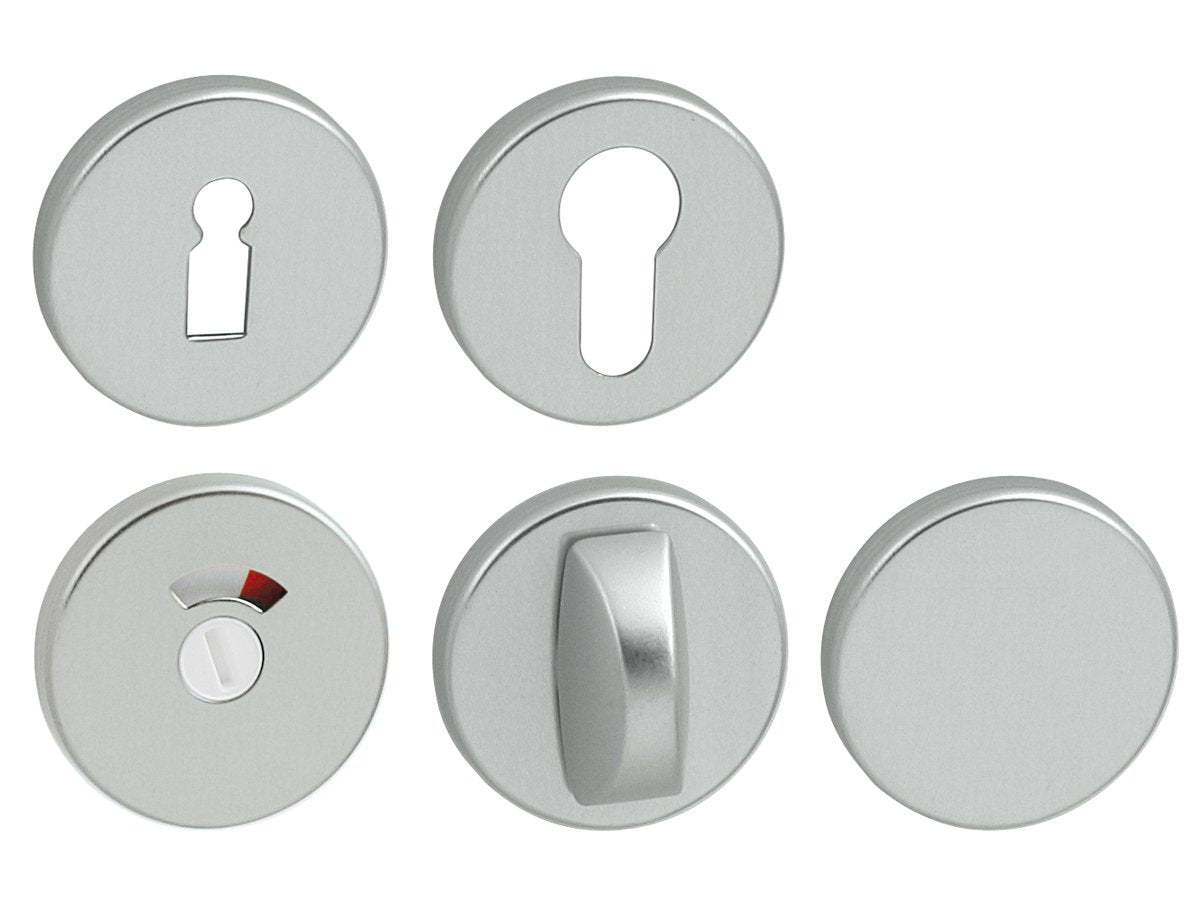 The round rosette is made of aluminum and has a surface treatment. The rosette has a diameter of 50 mm, a thickness of 8 mm and an oval hole for an interior key (BB), a hole for a cylinder insert (PZ), a WC set with a built-in key and an indicator or a rosette without a hole, the so-called plug. The package contains 2 pieces of rosettes (a pair) and the toilet rosettes are in the package as a set.