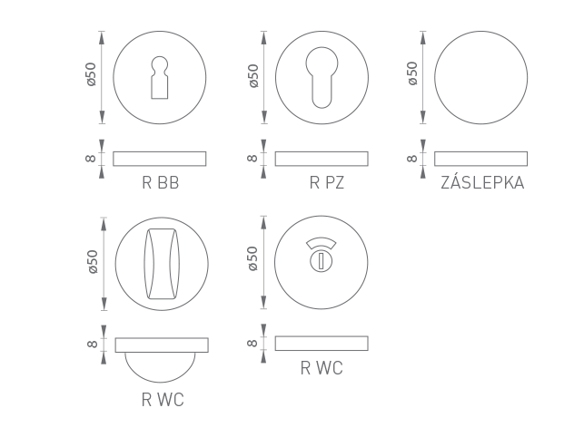 The round rosette is made of aluminum and has a surface treatment. The rosette has a diameter of 50 mm, a thickness of 8 mm and an oval hole for an interior key (BB), a hole for a cylinder insert (PZ), a WC set with a built-in key and an indicator or a rosette without a hole, the so-called plug. The package contains 2 pieces of rosettes (a pair) and the toilet rosettes are included in the package as a set.