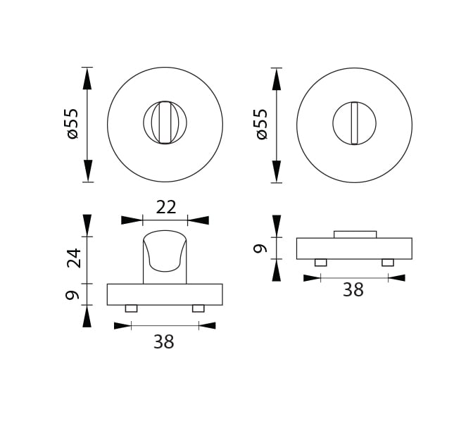 The round rosette is made of high-quality stainless steel, known as stainless steel, and is surface treated. The rosette has a diameter of 54 mm, a thickness of 9 mm and an oval hole for an interior key (BB), a hole for a cylinder insert (PZ), a WC set with a built-in key, a WC set with a built-in key and an indicator or a rosette without a so-called hole. plug. The package contains 2 pieces of rosettes (a pair) and the toilet rosettes are in the package as a set.