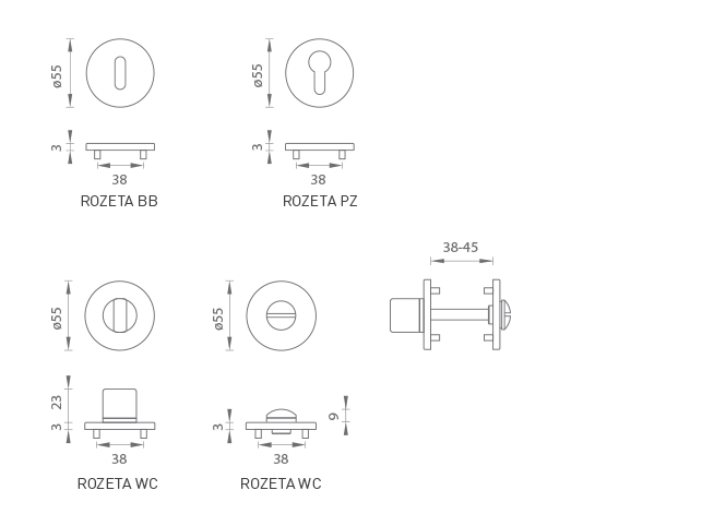 The round rosette is made of high-quality stainless steel, known as stainless steel, and is surface treated. The rosette has a diameter of 55 mm, a thickness of only 3 mm and an oval hole for an interior key (BB), a hole for a cylinder insert (PZ) or a WC set with an installed key. The package contains 2 pieces of rosettes (a pair) and the toilet rosettes are in the package as a set.
