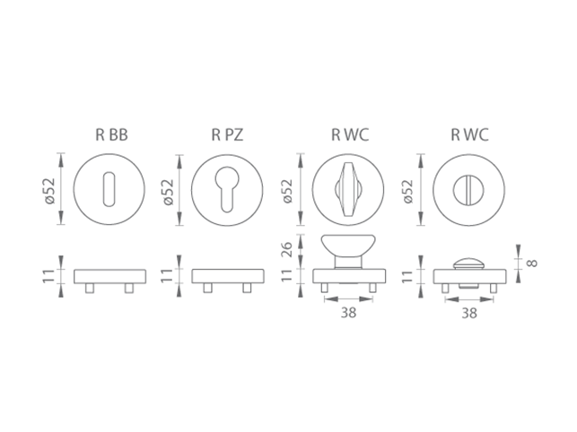 The round rosette is made of high quality materials - brass and is surface treated. The rosette has a diameter of 52 mm, a thickness of 11 mm and an oval hole for an interior key (BB), a hole for a cylinder insert (PZ), a toilet set with a built-in key or a rosette without a hole, the so-called plug. The package contains 2 pieces of rosettes (a pair) and the toilet rosettes are included in the package as a set.