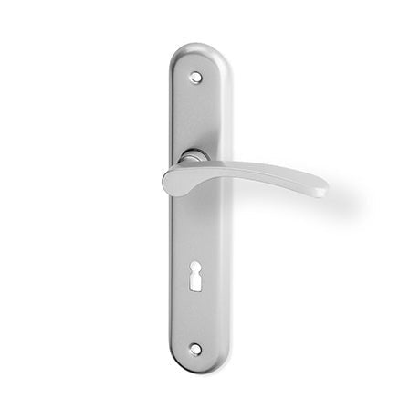 The elegant Viola shield door handle in sophisticated silver finish is available with either 72mm or 90mm pitch options. Choose your preferred functionality€”box key, FAB lock insert, or WC lock€”to match your specific requirements. Each purchase includes the convenient clique-clique mechanism and a complete set with fittings for both door sides plus all mounting accessories, protected by our comprehensive 24-month warranty.